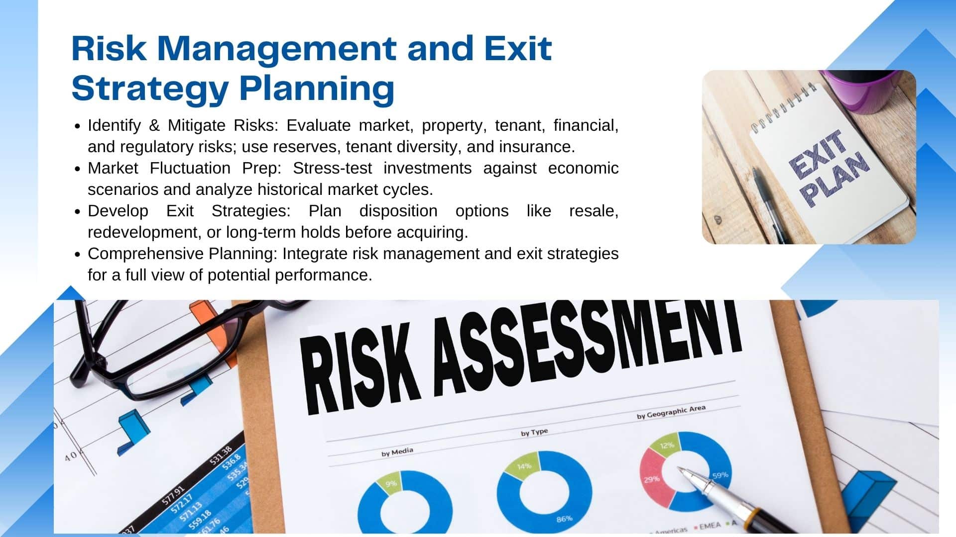 Retail property investment requires a thorough approach to risk management and exit planning to ensure long-term success. Every investment carries inherent risks, and retail properties are no exception. Mitigating these risks is critical to safeguarding your investment.