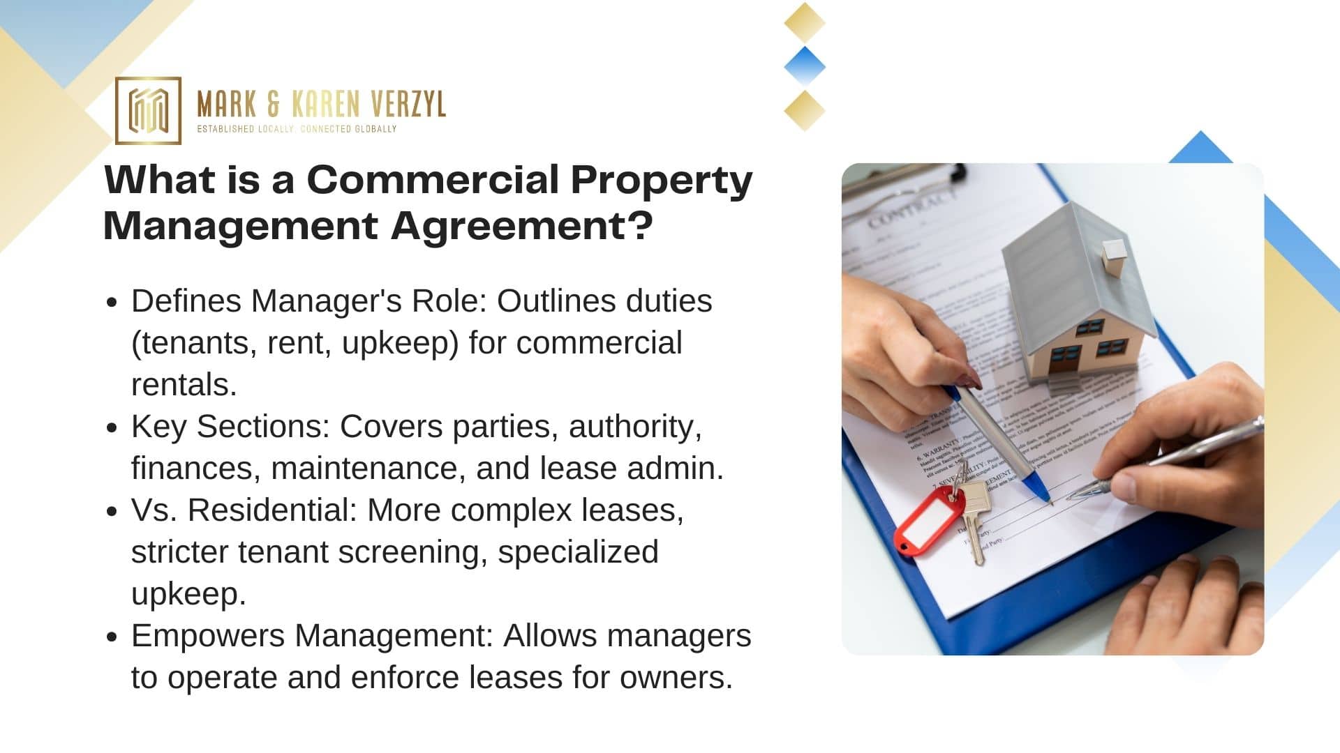 A comprehensive commercial property management agreement includes several key components. These typically cover: