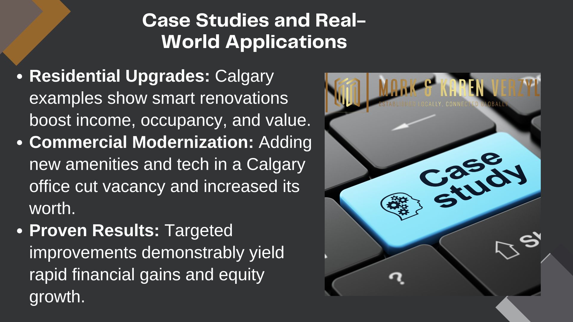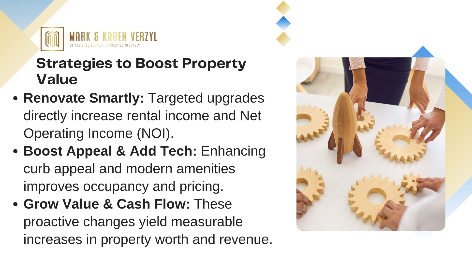 Ready to unlock your asset’s full potential? Contact Mark Verzyl’s professionals today for tailored strategies that maximize returns through calculated, data-driven enhancements.