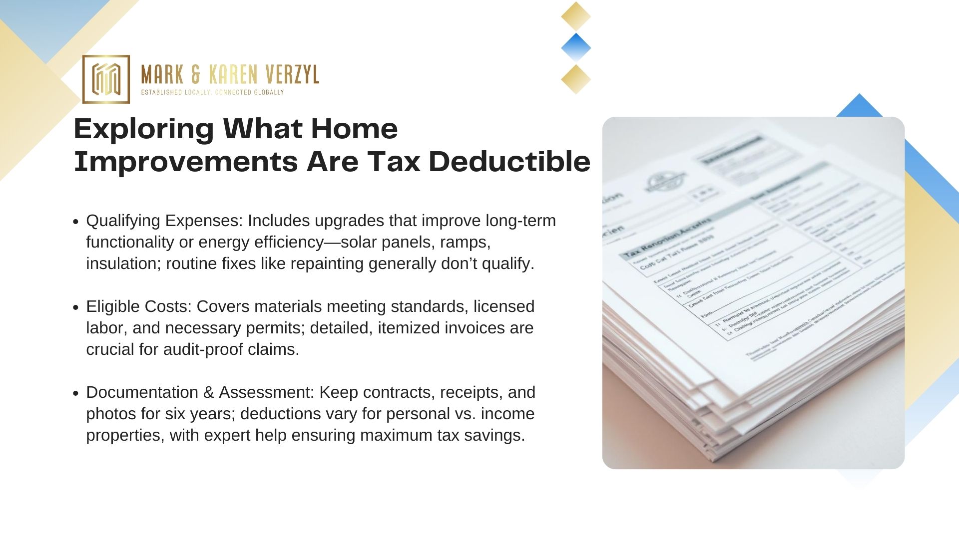 Property owners should consult experts to navigate application processes. Mark Verzyl Real Estate specialists help clients maximize federal incentives while planning value-boosting upgrades that benefit both family needs and long-term property potential.