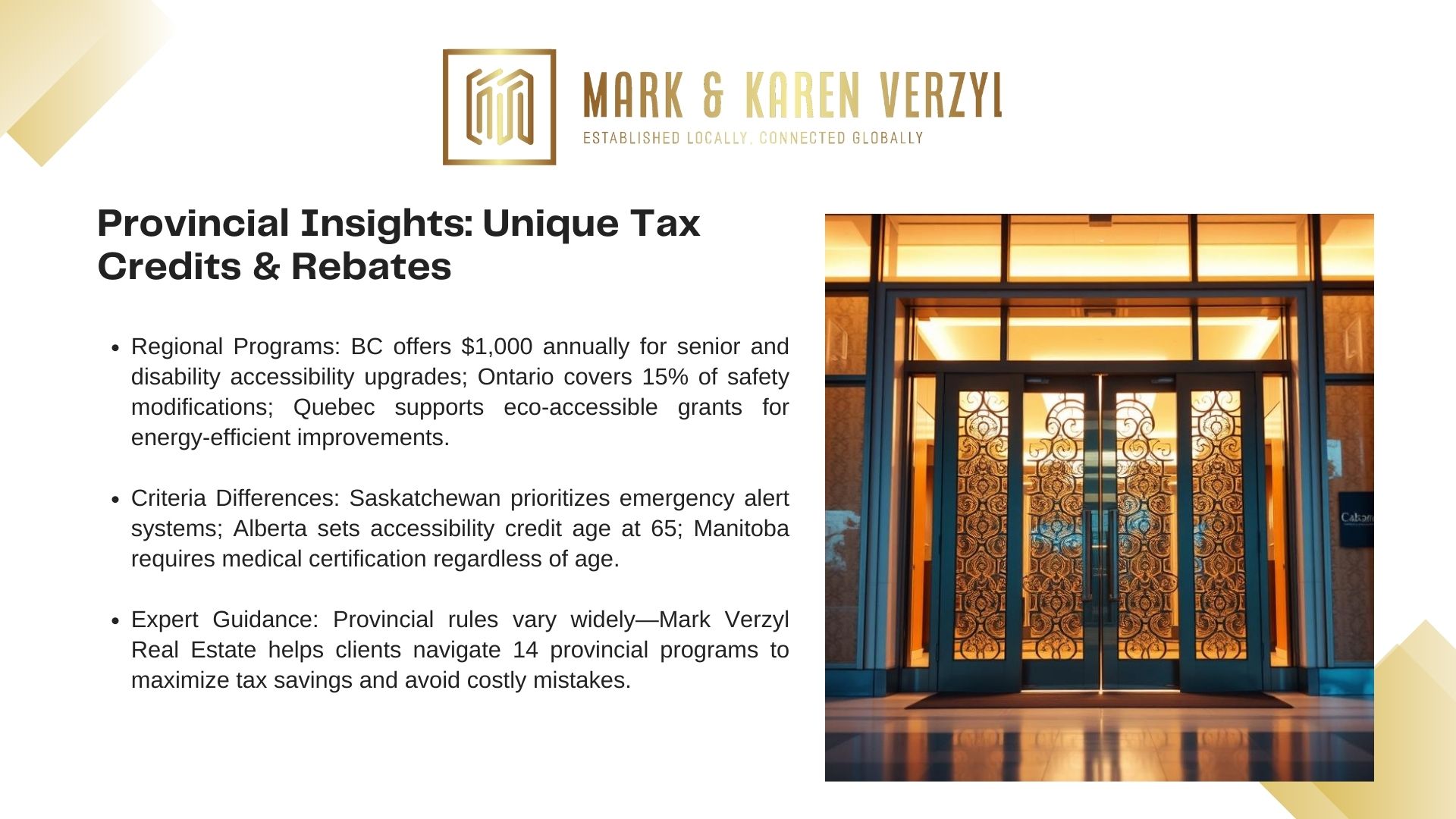 These initiatives often require pre-approval and professional certifications. Mark Verzyl Real Estate advisors help clients align projects with current program criteria.