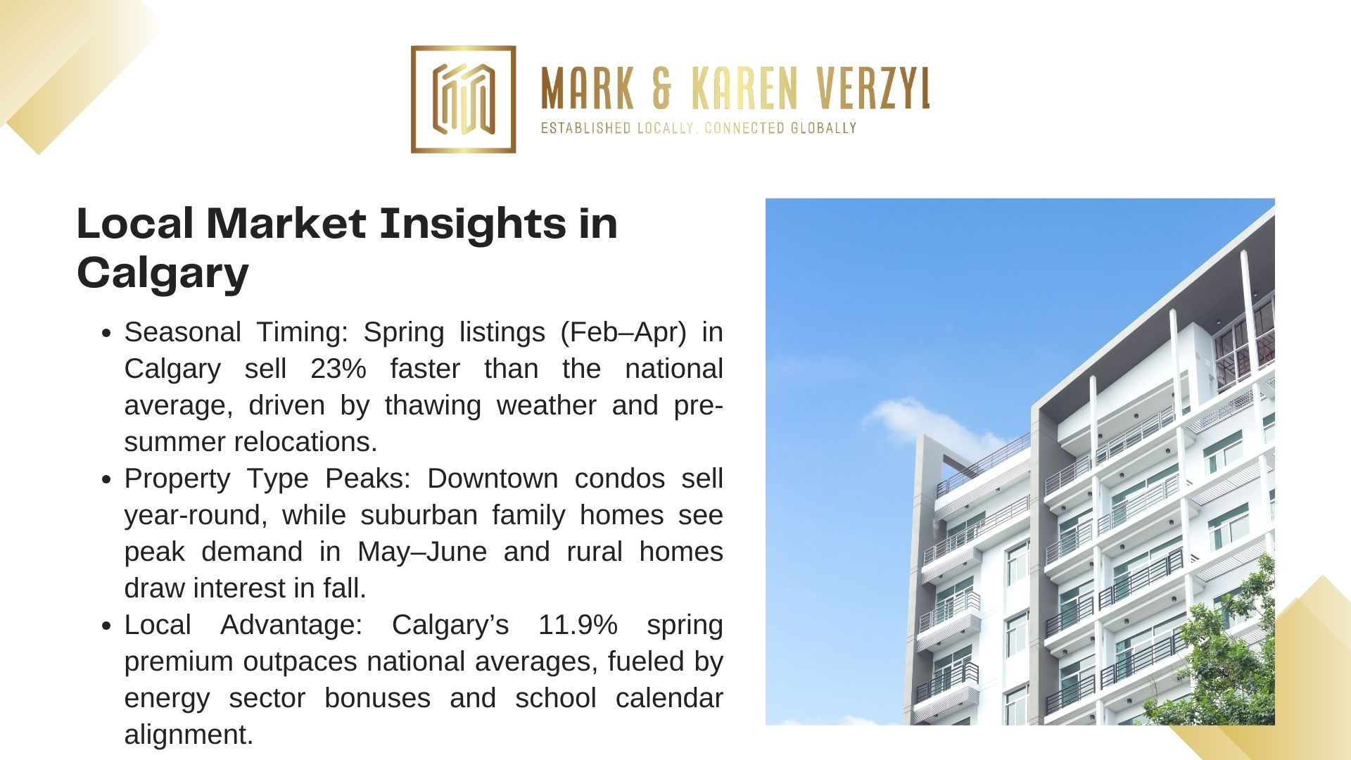 Mark Verzyl Real Estate leverages decades of Calgary market knowledge to turn challenges into advantages. Whether capitalizing on seasonal peaks or off-cycle opportunities, informed decisions consistently outperform guesswork.