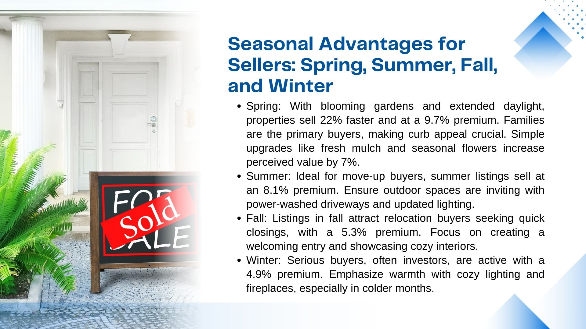 | Season | Avg. Premium | Days on Market | Key Advantage |