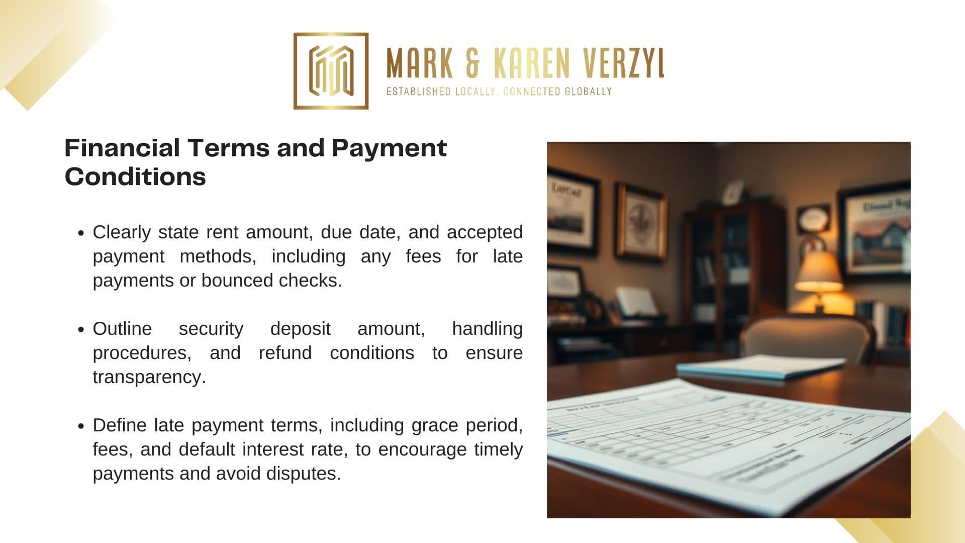 To ensure a smooth landlord-tenant relationship, it’s essential to define the financial terms and payment conditions in the lease agreement. This clarity helps prevent misunderstandings and ensures that both parties are aware of their responsibilities.